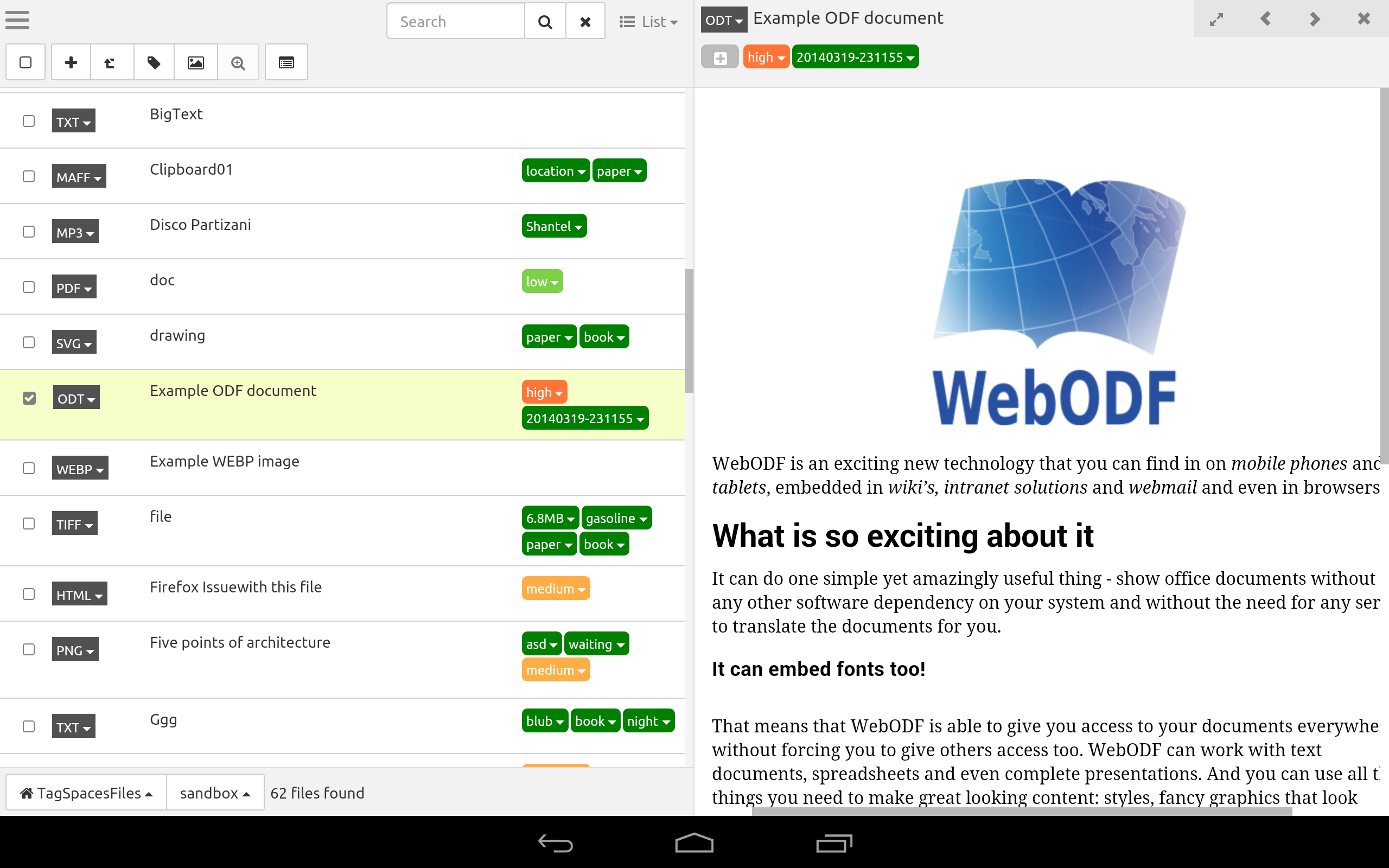 - The main improvement is supporting of ODF files (e.g. ODT, ODS, ODG, ODP). For this feature I have used a library from the webodf.org. Unfortunately due some security restrictions it have to be disabled in the chrome and the firefox extensions.